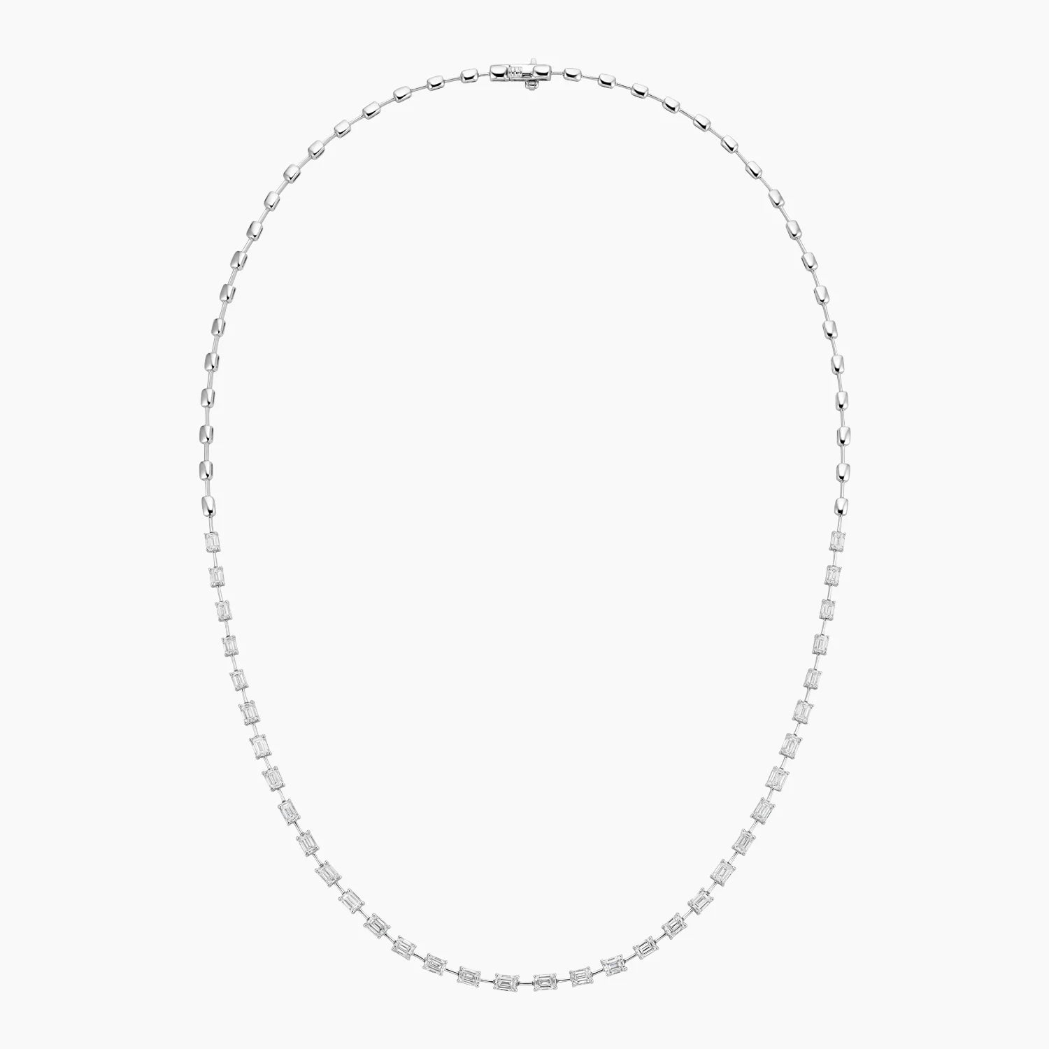 Shimmering emerald-cut lab diamonds wrap half of the way around this traditional tennis necklace for a modern, elevated look.