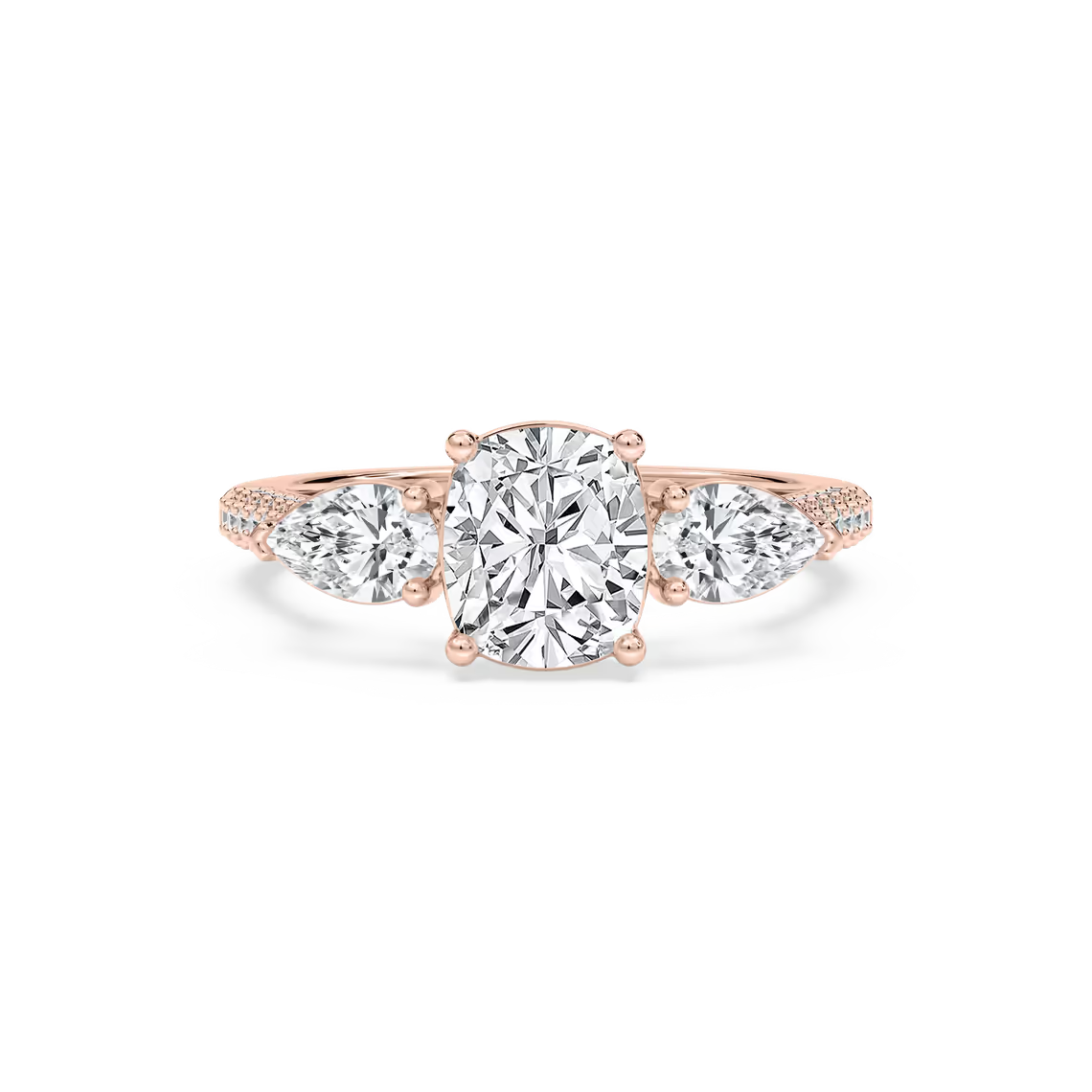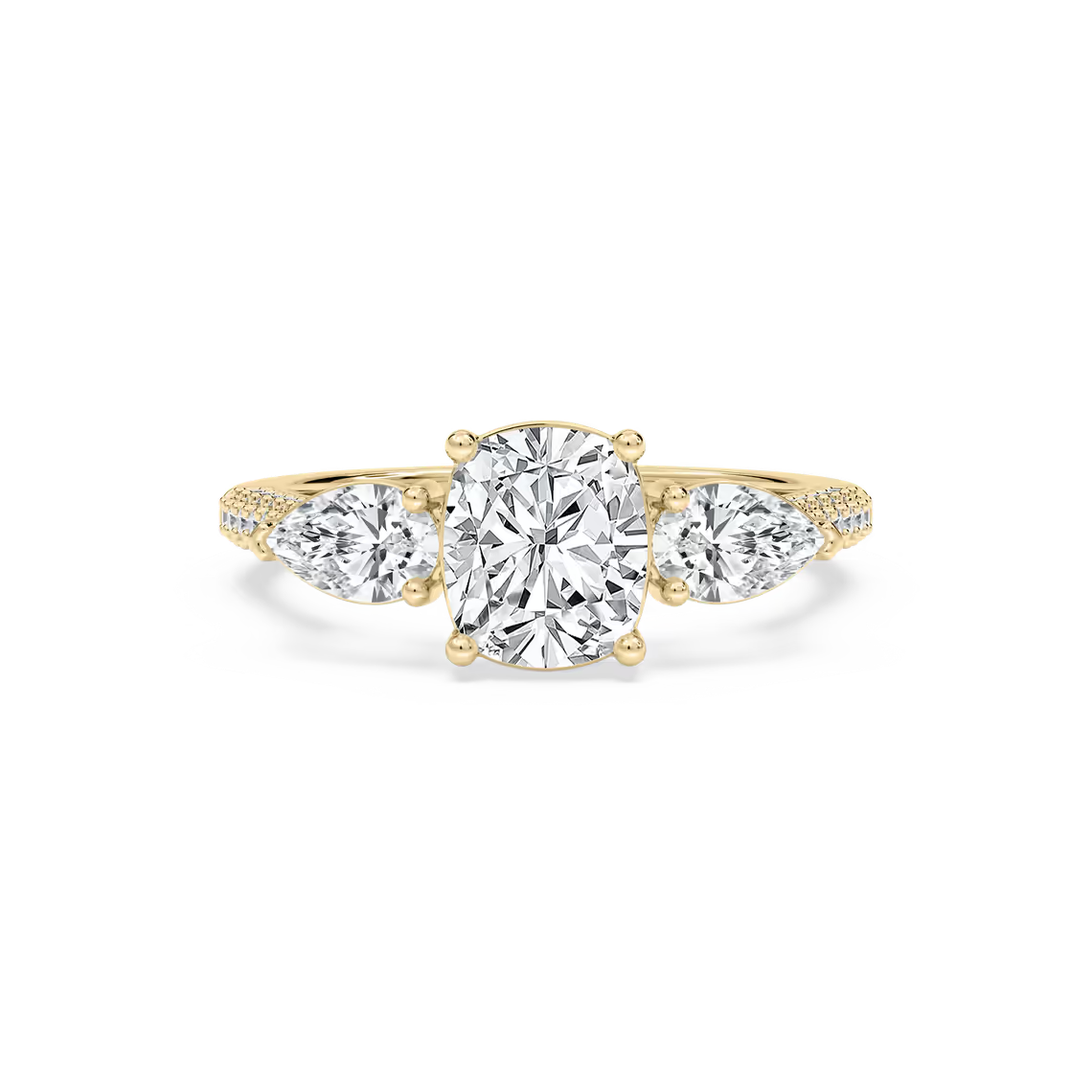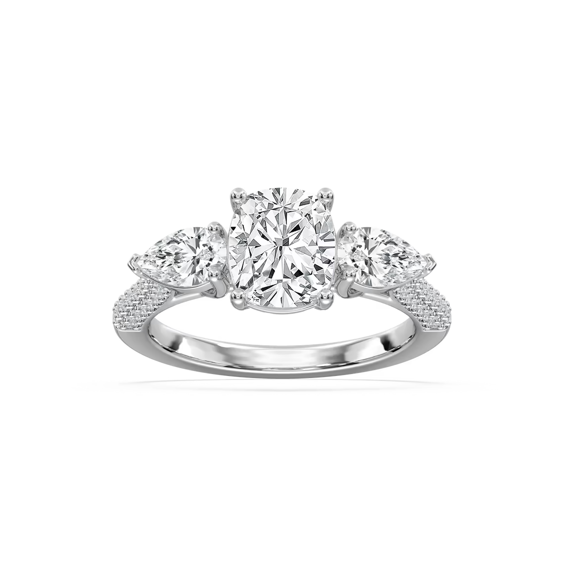 Dazzle her with the Ryan Three Stone engagement ring, featuring an exquisite cushion-cut diamond center stone and delicate shoulders that shimmer with pear-shaped diamonds. Available in your choice of 14K or 18K White, Yellow, or Rose Gold.